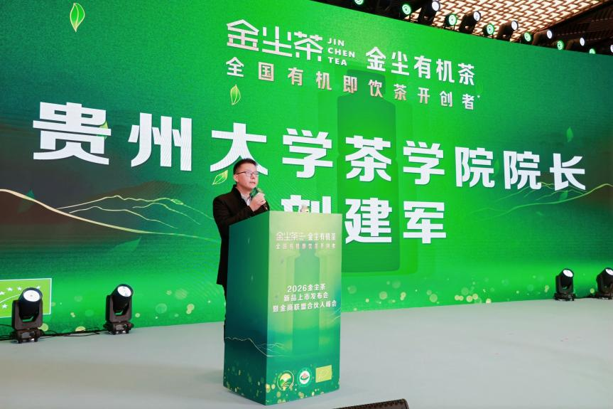 贵州大学茶学院院长刘建军在发言中肯定了金尘茶在校企合作模式上的探索。他指出,这种“高校+企业+产业”的创新生态有助于推动茶产业标准化发展,将贵州的生态优势转化为品牌优势,为茶产业高质量发展和乡村振兴注入科技动能。